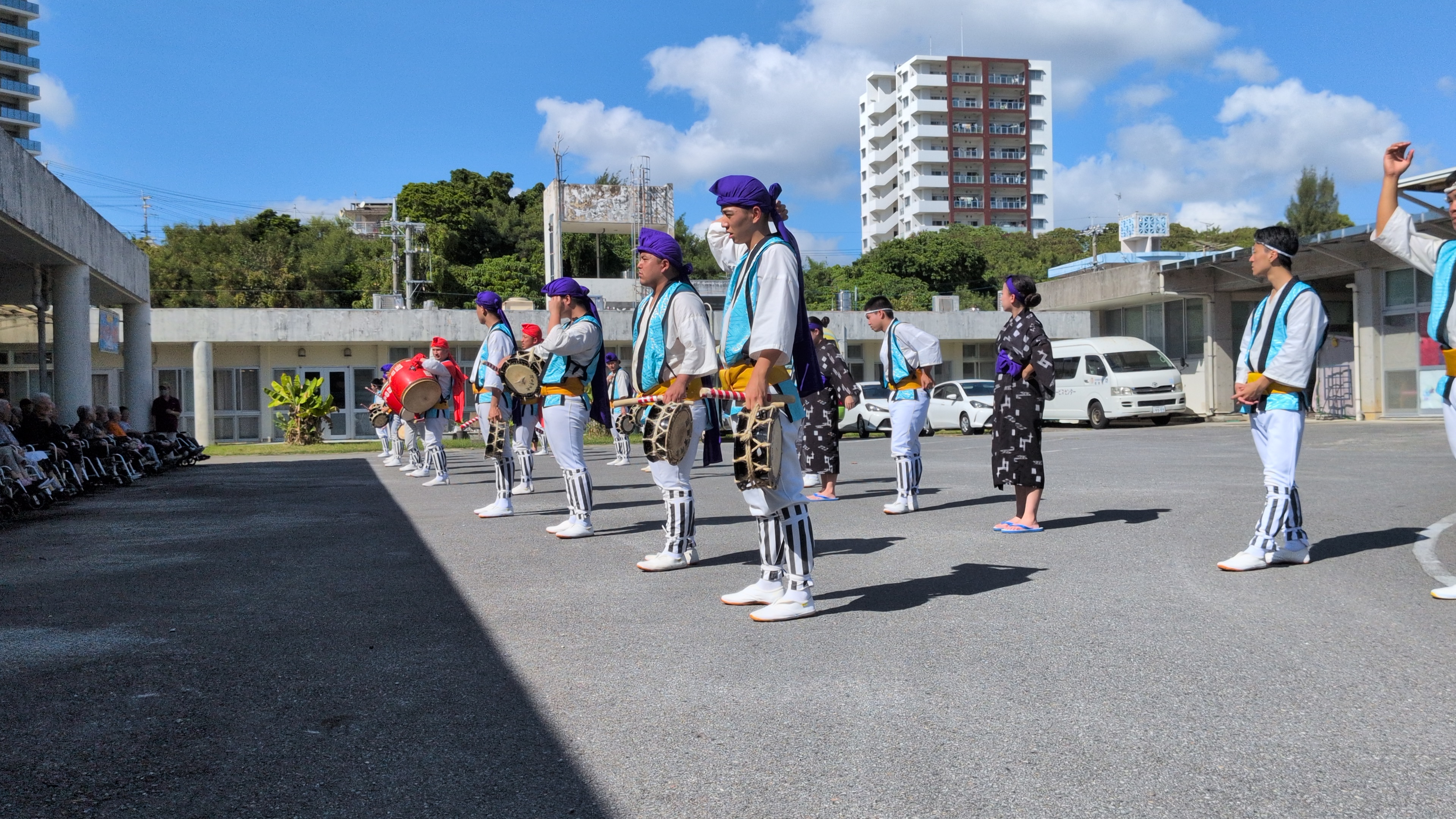 10/12(日)に毎年恒例の園田青年会によるエイサー慰問がありました。当初9/14の予定が延期になり約一か月遅れでの開催となりました。
